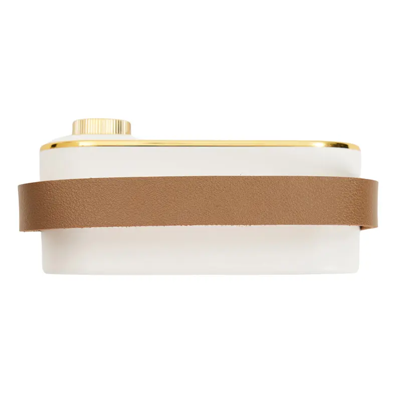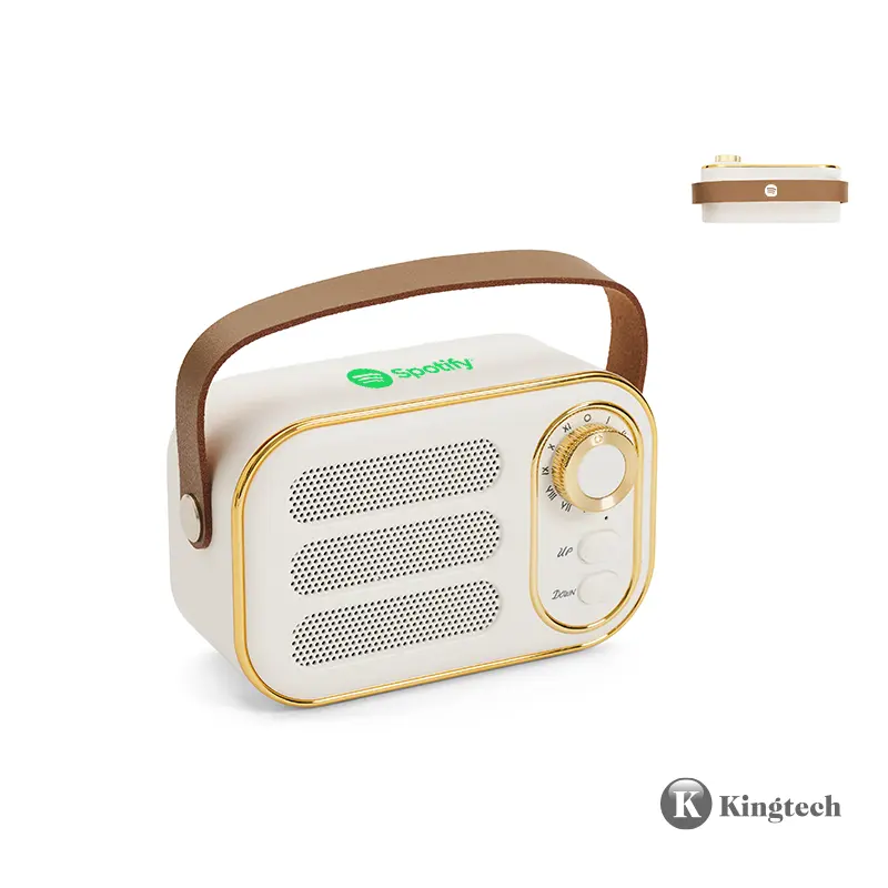 Parlante vintage blanco con correa. Hecho de plástico ABS y cuero PU. Cuenta con correa superior, perilla frontal, botones de control, conexión USB-C, radio FM (87. 5–108 MHz), y compatibilidad con Bluetooth, tarjeta TF, USB y entrada AUX. Es ideal para ambientar espacios con estilo retro mientras disfrutás de tu música favorita.